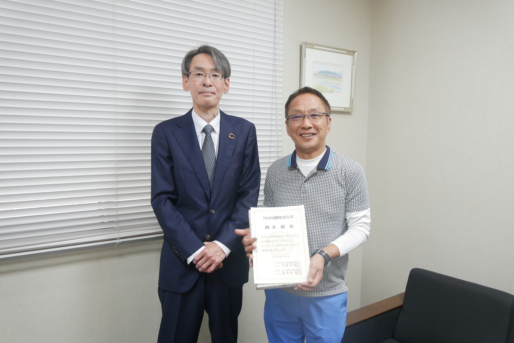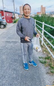 岡本 朗 2025.04.09 岡本 朗 (松山市) 小野川沿い遊歩道の清掃活動 岡本氏は数年前に勤務先を一旦退職し、時間に少し余裕ができたことから、何か地域に貢献したいと考えていた。時々散歩に出向く小野川沿いの遊歩道は、住民の散歩コースや石井北小学校児童の通学路にもなっているが、タバコの吸い殻や空き缶等の他、近年は使用済みマスクのゴミも目に付くことから、月3~4回、散歩の際に清掃活動を開始。 月日を重ねるうちに子ども達ともすっかり顔なじみとなり挨拶を交わす等、交流しながら活動を続けている。