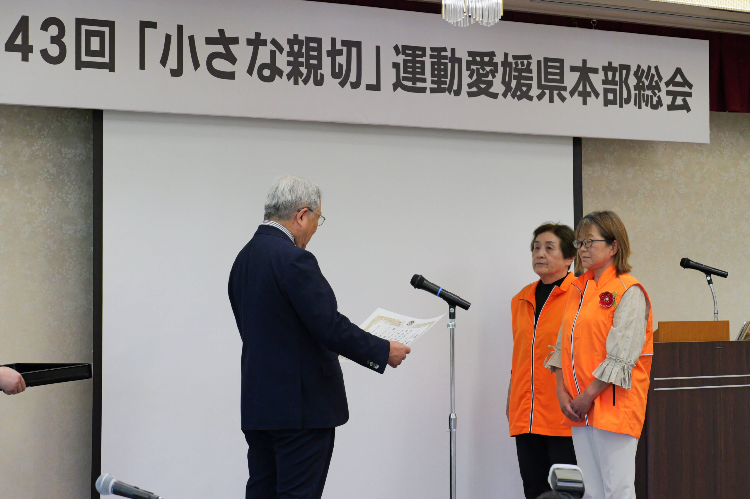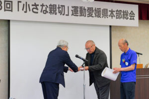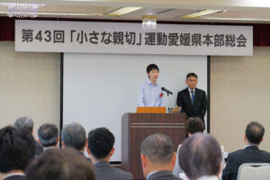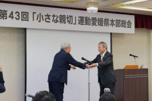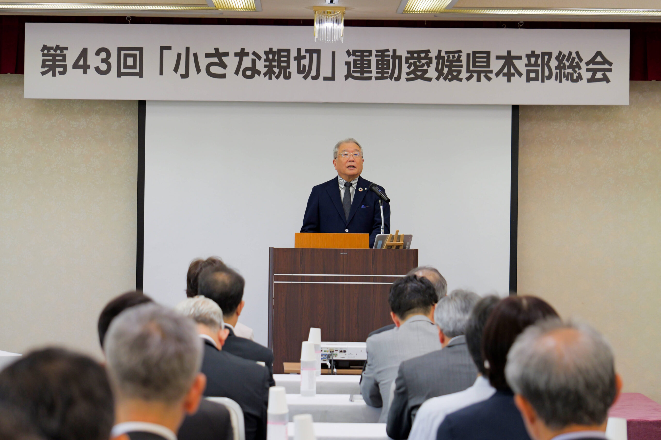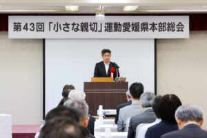 総会では、大塚岩男代表が「地域住民が互いに助け合う「共助」の精神が大切であり、「小さな親切」は、まさにこの「共助」の精神に通じている。災害時においても大きな力となり、災害に強い地域社会を築く礎になると確信している」と挨拶した後、愛媛県保健福祉部長の岡部直様よりご祝辞を頂戴しました。
