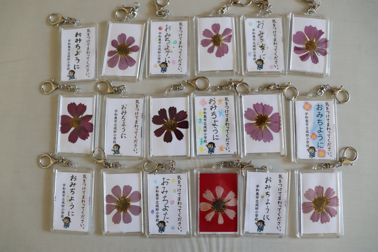 宇和島市立成妙小学校は今回、初めて「コスモス・ヒマワリの花」コンクールに参加されました。お遍路さんに自ら育てたコスモスの押し花で作ったキーホルダーを100個も配布しました。また、旅の安全を願う「おみちように」と書かれたカードを掲げ、旅の安全を願う気持ちを伝える「お接待プロジェクト」を実施しました。